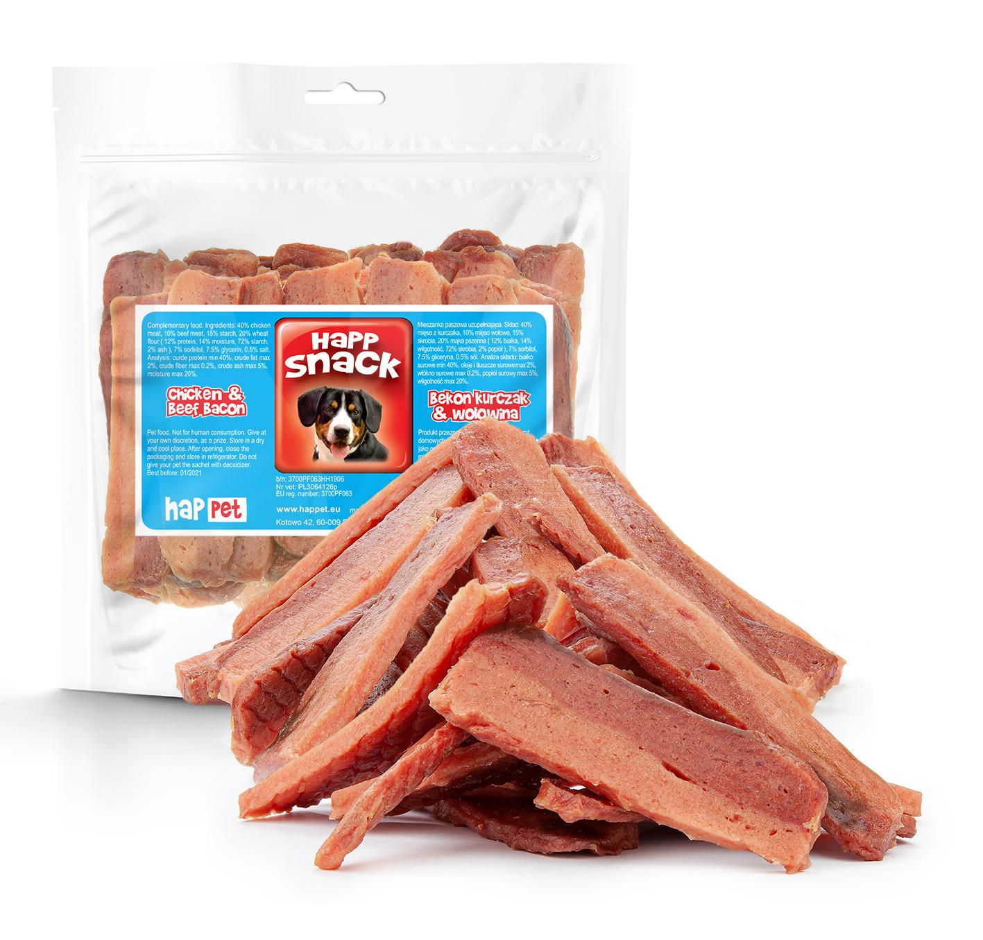 Bekon kurczak i wołowina – gryzak drobiowo-wołowy jako doskonałe uzupełnienie psiej diety. Przysmak ma naturalny, wspaniały aromat i uwielbiany przez wszystkie zwierzaki smak. Sprawdzą się jako zdrowa przekąska między posiłkami, nagroda za postępy szkoleniowe oraz gryzak zaspokajający naturalną potrzebę żucia. Pomaga też zachować zdrowe uzębienie i dziąsła – w trakcie ogryzania usuwany jest bowiem kamień nazębny i nalot bakteryjny.