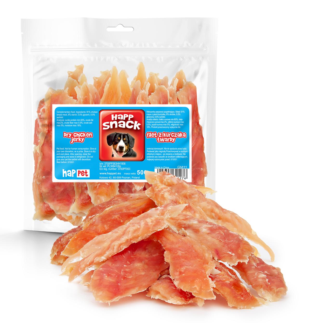 Skład: 91% mięso z piersi kurczaka, 8% skrobia, 0,5% gliceryna, 0,5% sorbitol