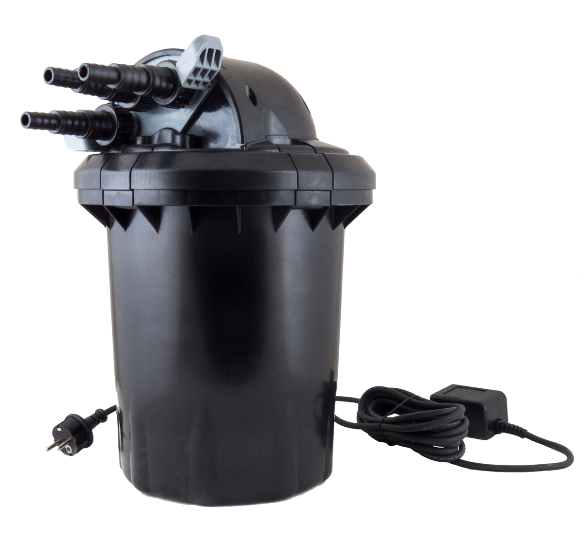Wbudowana lampa UV, sterylizuje przepływającą przez kubeł filtracyjny wodę, eliminując glony oraz chorobotwórcze drobnoustroje. Zapobiega tym samym obniżającym walory estetyczne sadzawki inwazjom glonów oraz pozwala stworzyć przyjazne środowisko życia dla ryb i innych mieszkańców oczka. System oczyszczenia przeciwprądowego umożliwia czyszczenie wkładów bez potrzeby otwierania pokrywy. Wysoka jakość wykonania, gwarantuje bezawaryjną pracę przez długie lata.