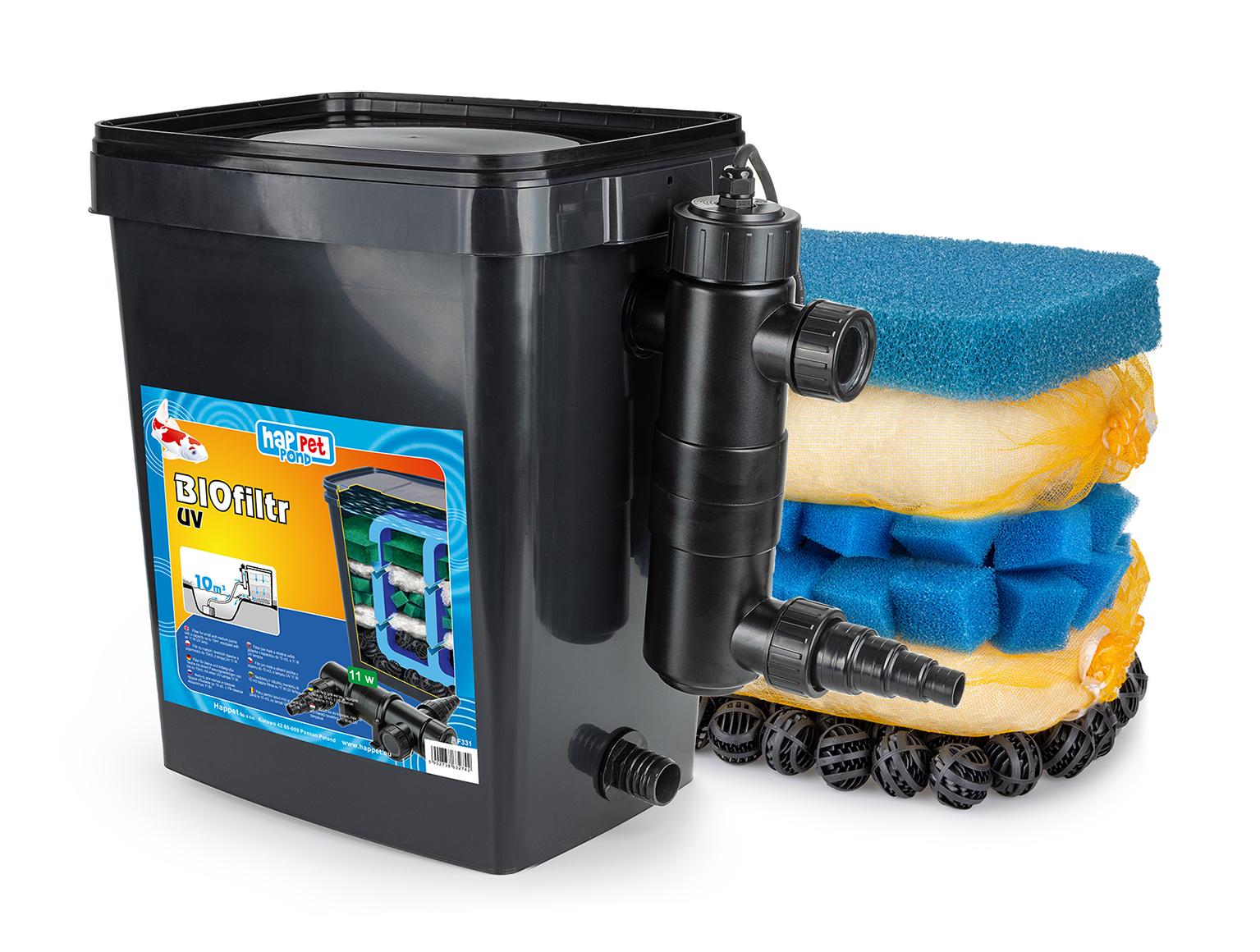 Biofiltr UV to zestaw filtracyjny do oczka lub stawu wodnego. Filtr posiada dołączoną do zestawu lampę UV o mocy 11W, która sterylizuje wodę, niszczy wszelkie drobnoustroje, pierwotniaki i bakterie chorobotwórcze. Pomaga utrzymać krystalicznie czystą wodę niszcząc glony szczególnie dokuczliwe przy zakwicie tzw. efektem zielonej wody. Sterylizator to jeden ze skuteczniejszych sposobów na walkę z glonami i czynnikami chorobotwórczymi. Lampa pozwala na utrzymanie oczka wodnego w dobrej kondycji bez użycia środków chemicznych.