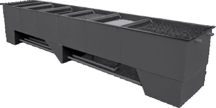 Pompa z sadzawki tłoczy wodę do pierwszego modułu, gdzie zostaje skierowana do dolnej części modułu. Tutaj strumień wody wyhamowuje i wytrącają się najgrubsze zanieczyszczenia.