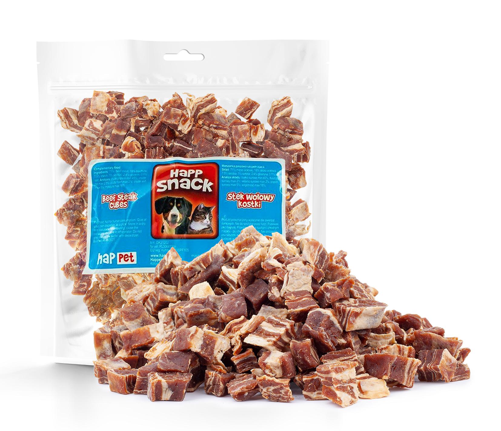 Wyśmienite urozmaicenie diety psów, kotów oraz innych ssaków mięsożernych (fretek, jeży pigmejskich, skunksów, lisów rudych). Mięso wołowe obfituje w wysokiej wartości biologicznej białko, witaminy z grupy B (B1, B2, B12) oraz zapobiegające anemii żelazo. Dodatek skóry wołowej wzbogaca smakołyk o kolagen, pomagający utrzymać w dobrej kondycji stawy. Niska zawartość tłuszczu czyni stek wołowy kostki, dobrym komponentem diety ubogotłuszczowej, stosowanej dla zwierząt otyłych i zmagających się z chorobami wątroby oraz trzustki. Dzięki suszeniu, produkt zachowuje długo zdatność do spożycia, bez dodatku sztucznych konserwantów.