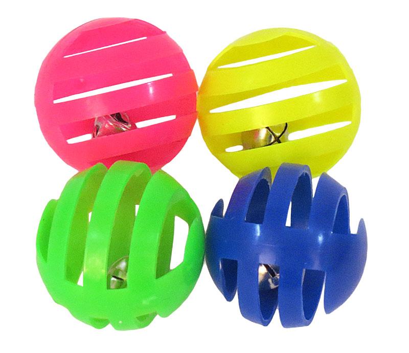 Zestaw czterech zabawek dla kotów. Piłki występują w różnych kolorach.