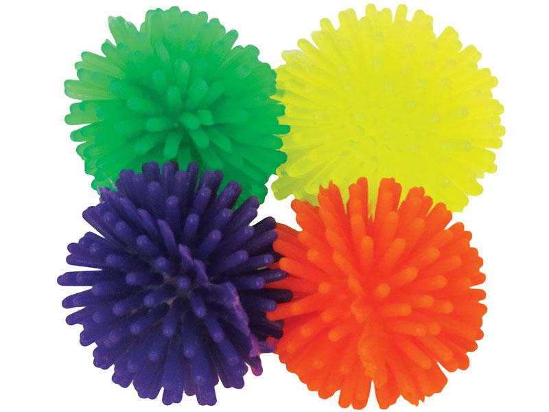 Kolorowe piłeczki dla kotów z gumy zapewniają stymulację do aktywności fizycznej i intelektualnej. Wypustki na piłkach przyciągają uwagę kocich pupili, zaciekawiając i angażując do radosnej zabawy. Zabawki występują w czterech wersjach kolorystycznych: niebieskim, żółtym, czerwonym i zielonym.