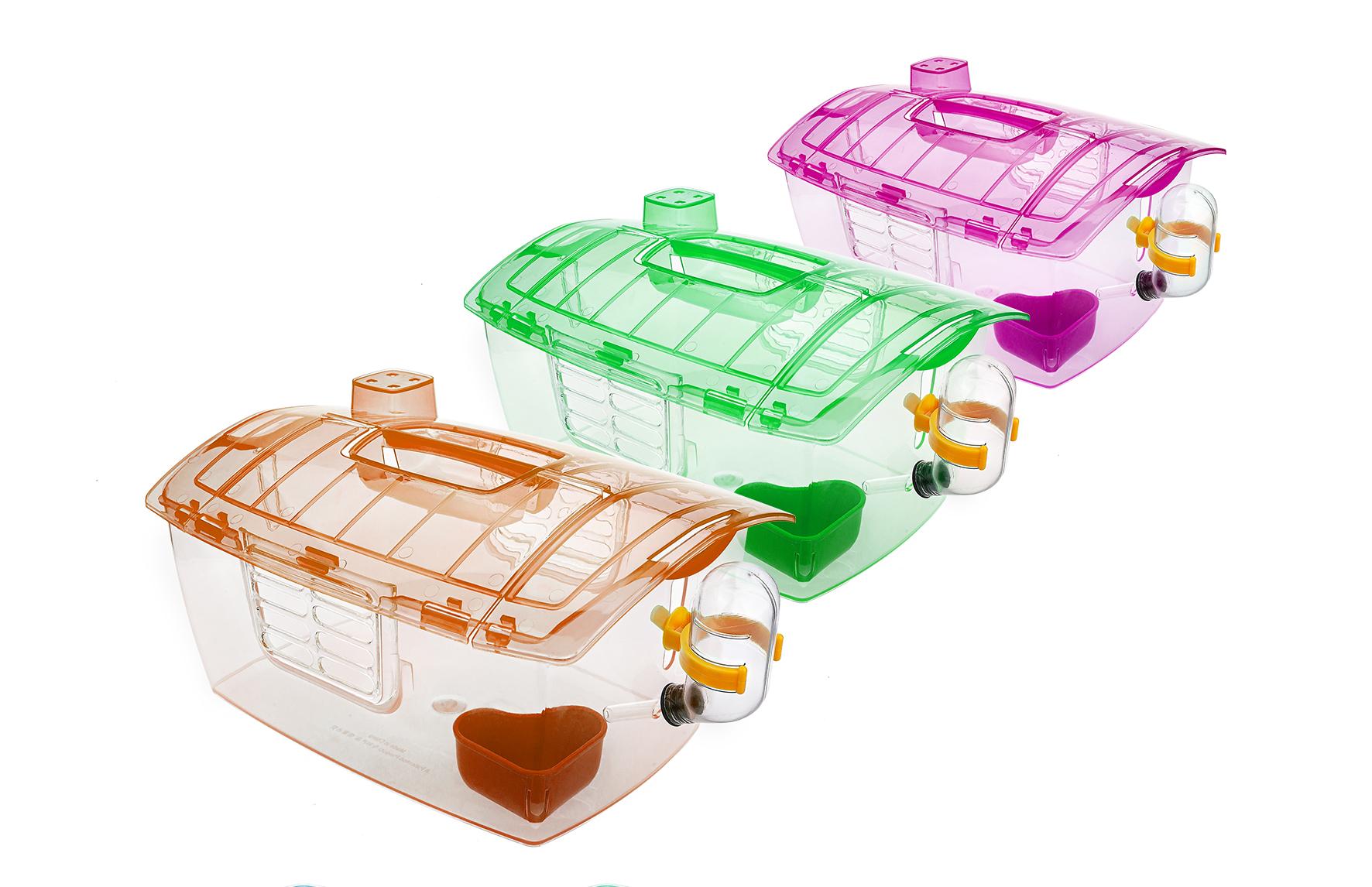 Produkt wykonano z nietoksycznego, wytrzymałego tworzywa sztucznego. Wyposażony jest w poidełko, miseczkę na karmę oraz okienko wentylacyjne, zapewniające stały dostęp do świeżego powietrza. Daszek domku jest otwierany i posiada wygodny uchwyt ułatwiający przenoszenie.
