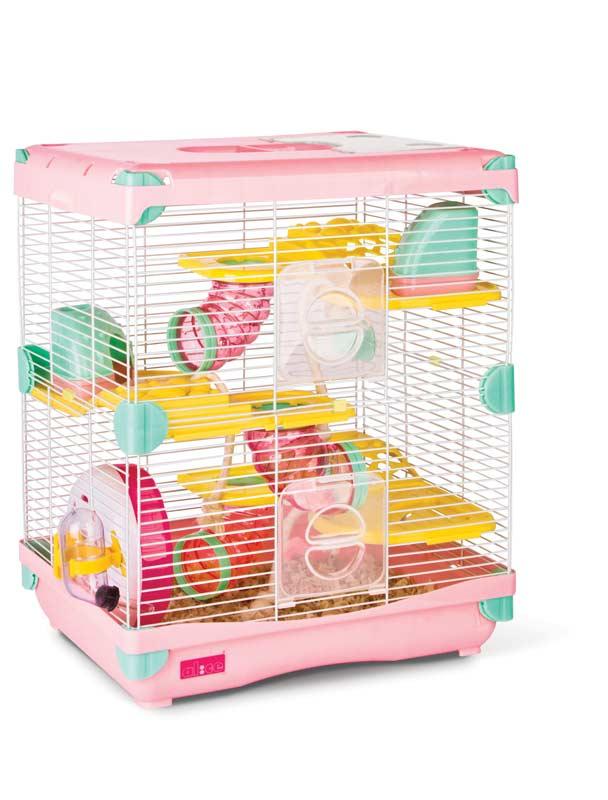 Gremi Adventure Land składa się z klatki drucianej i plastikowej górnej pokrywy oraz podstawy. Dwupiętrowa, wyposażona w kołowrotek, 3 tunele, 3 półki, 3 linki, 2 domki, miseczkę i poidełko, klatka jest bardzo atrakcyjna dla chomików, które potrzebują dużo ruchu. Zwierzęta mają w niej bardzo dużo przestrzeni i elementów, które umożliwiają swobodną zabawę. Dzięki zastosowaniu specjalnych plastikowych zacisków do łączenia ścianek, montaż klatki jest bezproblemowy. Można ją otwierać zarówno od góry, jak i z boku, gdzie znajdują się plastikowe drzwiczki. Dostępna w trzech różnych kolorach.