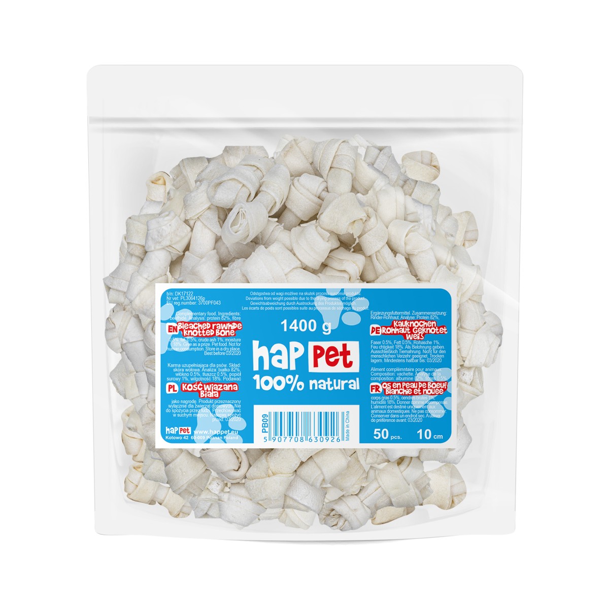 Kości firmy Happet produkowane są ze specjalnej masy przygotowywanej z rozgotowanej skóry wołowej, która następnie zostaje wysuszona i sprasowana na kształt prawdziwej kości.