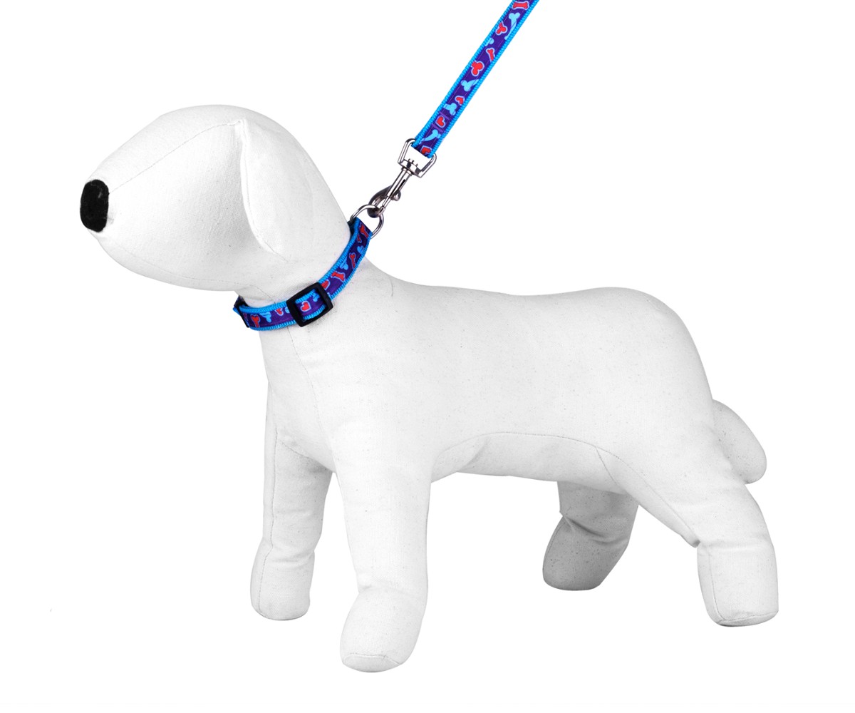 Komplet obejmuje smycz i obrożę. Wykonany jest z mocnej taśmy nylonowej z naszytą ozdobną taśmą.