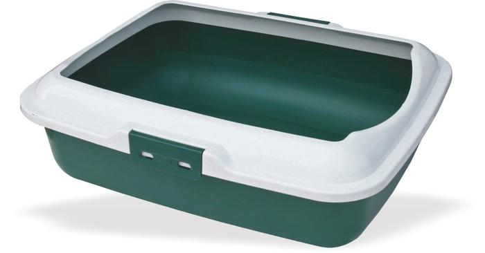 Kuweta z wysoką ramką zapobiegającą rozsypywaniu żwirku poza kuwetę.