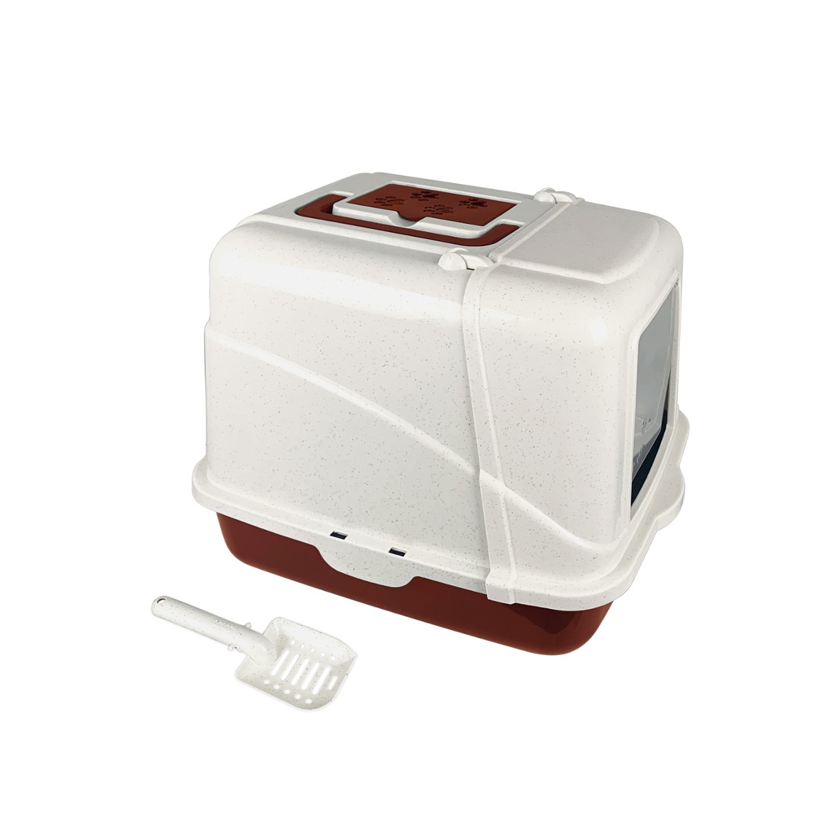 Dzięki uchwytowi górnemu można przenosić kuwetę. Wahadłowe drzwiczki umożliwiają kotu bezproblemowe wchodzenie i wychodzenie z kuwety.