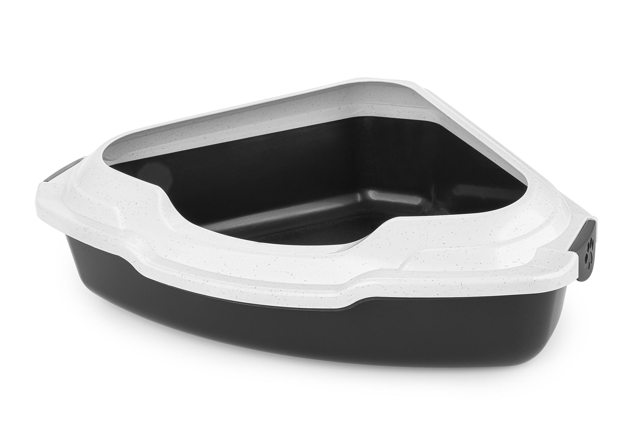 Kuweta narożna z ramką zapobiegającą rozsypywaniu żwirku poza kuwetę.