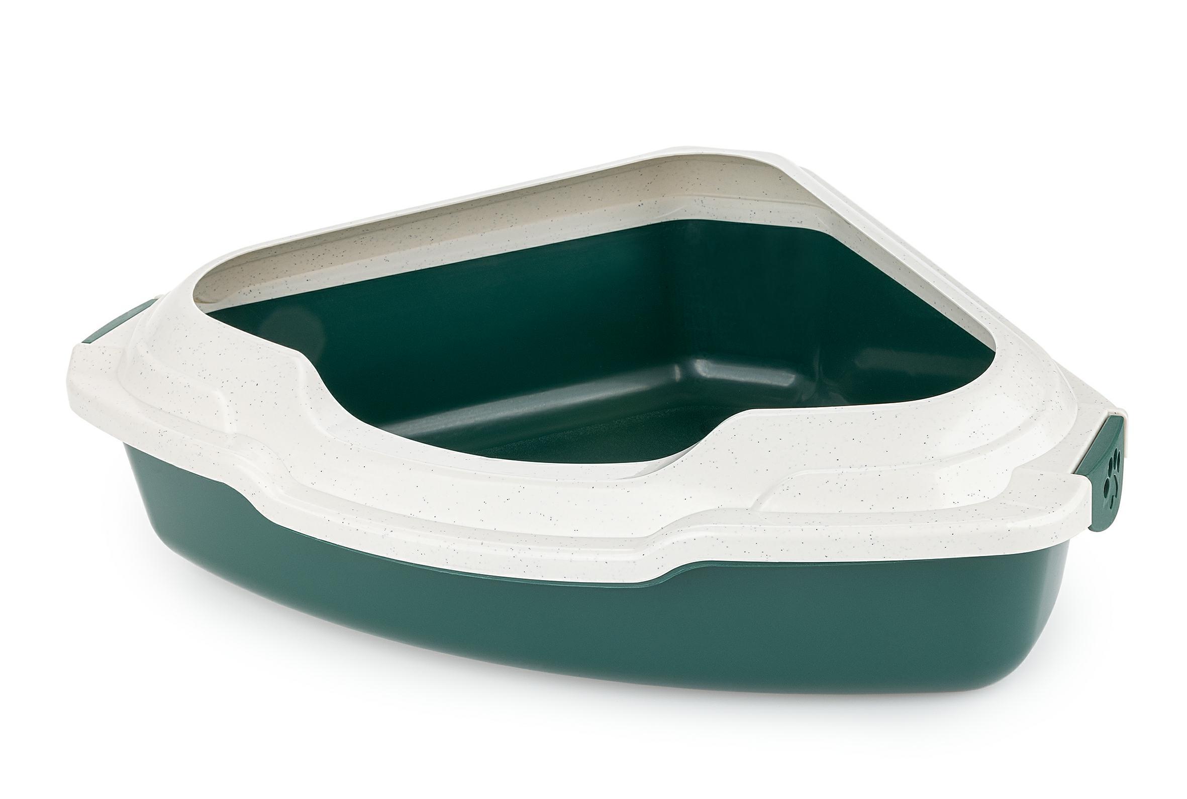 Kuweta narożna z ramką zapobiegającą rozsypywaniu żwirku poza kuwetę.