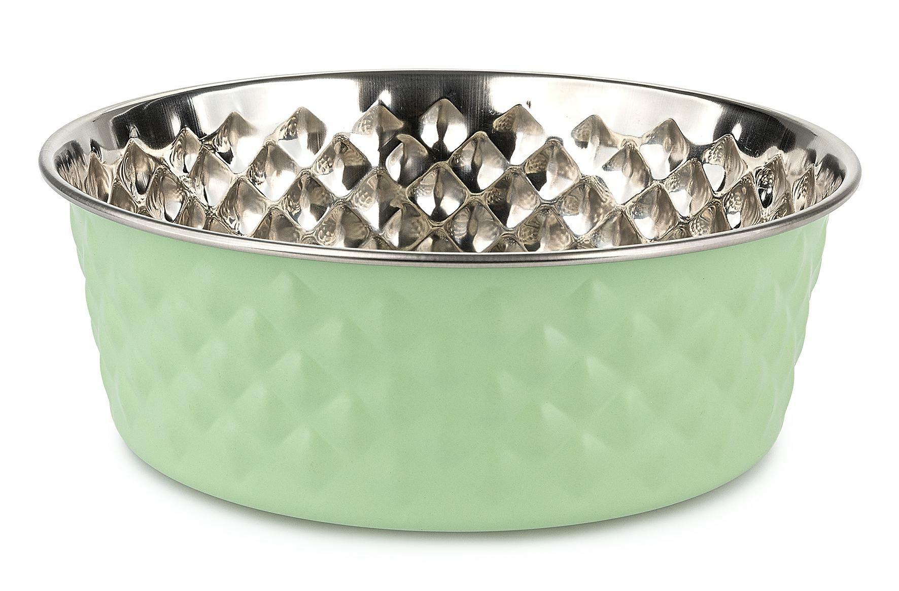 Miska w diamentowy wzór łączy klasyczny design z nowoczesnym wzorem, zachowując przy tym właściwości standardowej miski, do której przywykł Twój pupil. Dodatkowo posiada antypoślizgowe gumki zamocowane na spodzie, które sprawią, że pozostanie stabilna bez względu na zapał i radość z jaką zwierzak podejdzie do jedzenia. Została wykonana ze stali nierdzewnej, co sprawia że jest bezpieczna dla zwierząt, odporna na uszkodzenia i łatwa w czyszczeniu. Miska jest odpowiednia do podawania karmy suchej, karmy mokrej i wody.