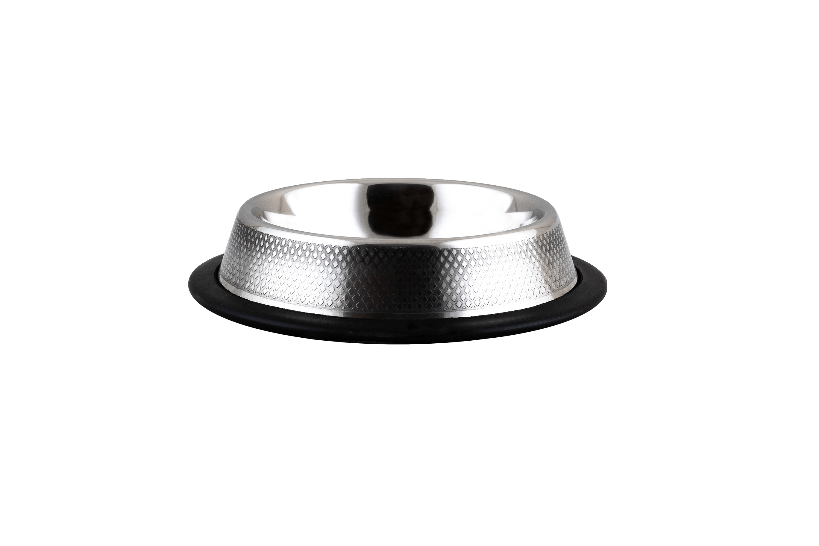 Miska wykonana ze stali szlachetnej na zewnątrz pokryta wytłaczanym wzorem. Posiada kształt utrudniający przewrócenie się miski oraz antypoślizgową gumową obręcz, która zapobiega przesuwaniu. Nadaje się zarówno do karmy, jak i wody.