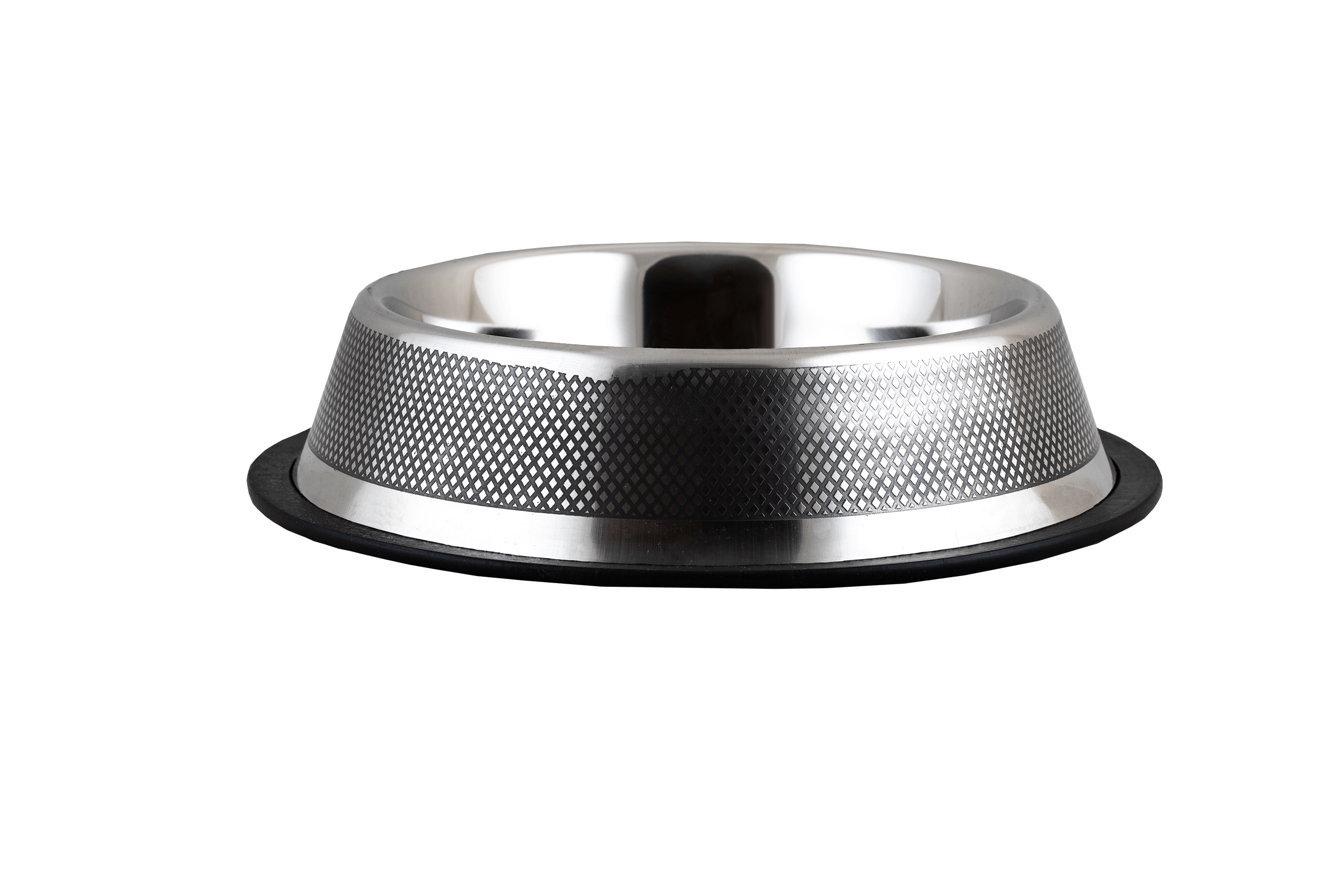 Miska wykonana ze stali szlachetnej na zewnątrz pokryta wytłaczanym wzorem. Posiada kształt utrudniający przewrócenie się miski oraz antypoślizgową gumową obręcz, która zapobiega przesuwaniu. Nadaje się zarówno do karmy, jak i wody.