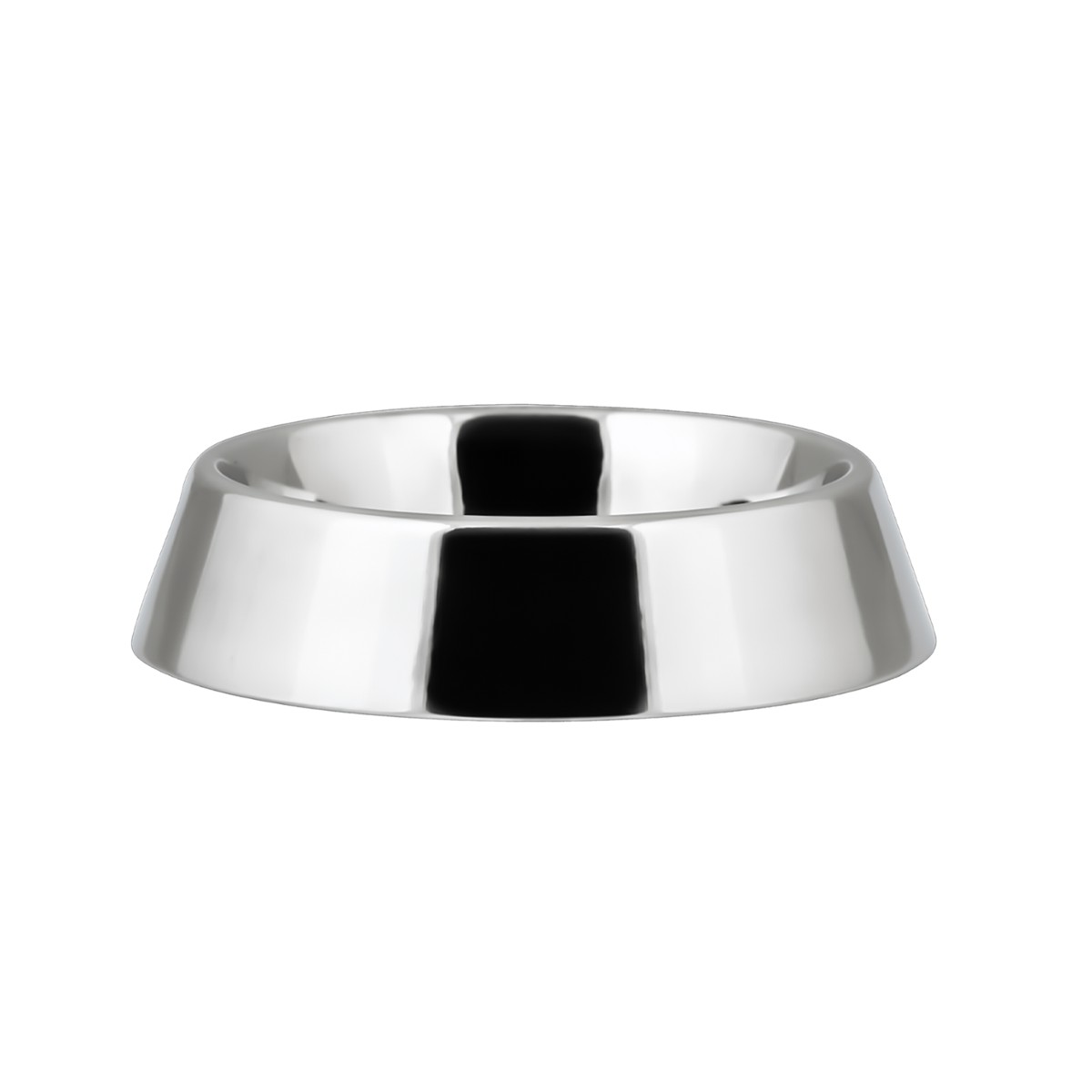 Metalowa miska w kolorze srebrnym, z błyszczącym wykończeniem, wykonana ze stali nierdzewnej.