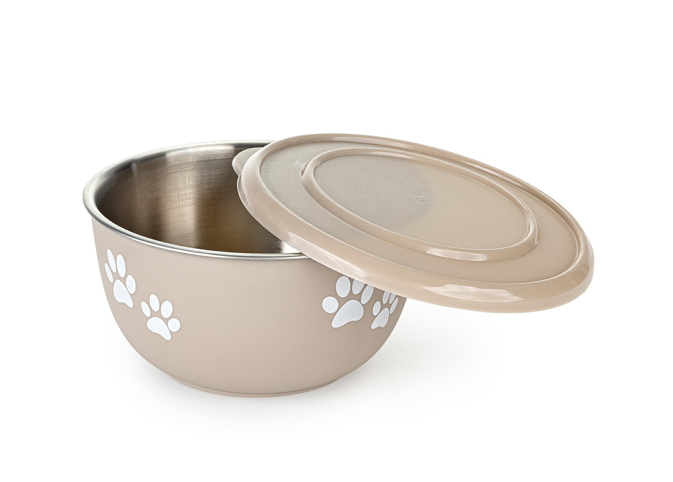 Metalowa miska z zamknięciem, błyszczącym środkiem w kolorze srebrnym, oraz matowym wykończeniu w białe łapki na zewnątrz.