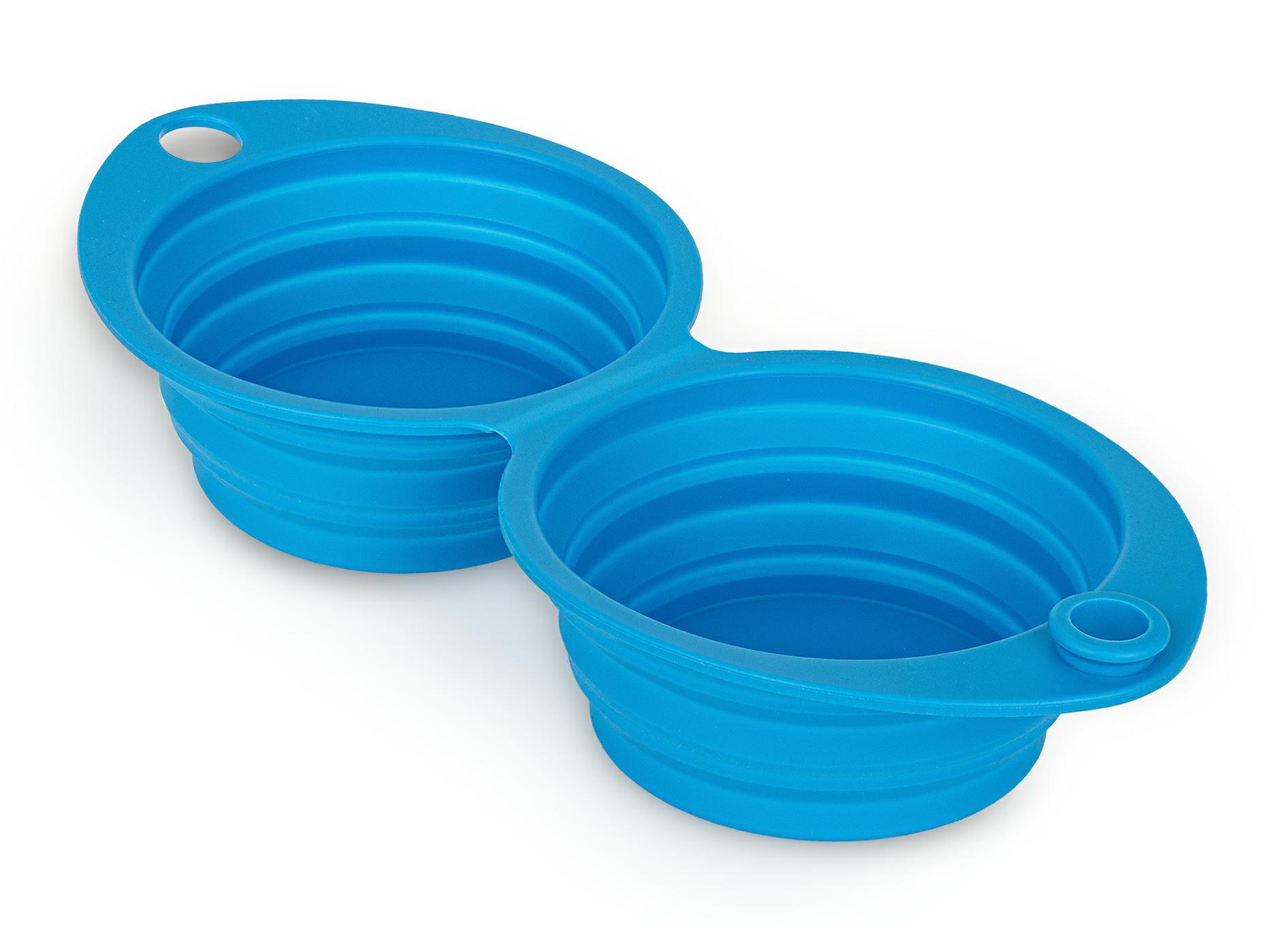 Podwójna składana miska nadaje się do podawania wody oraz mokrej i suchej karmy. Każda z połączonych miseczek ma pojemność 350 ml. Produkt dostępny w kolorze niebieskim.