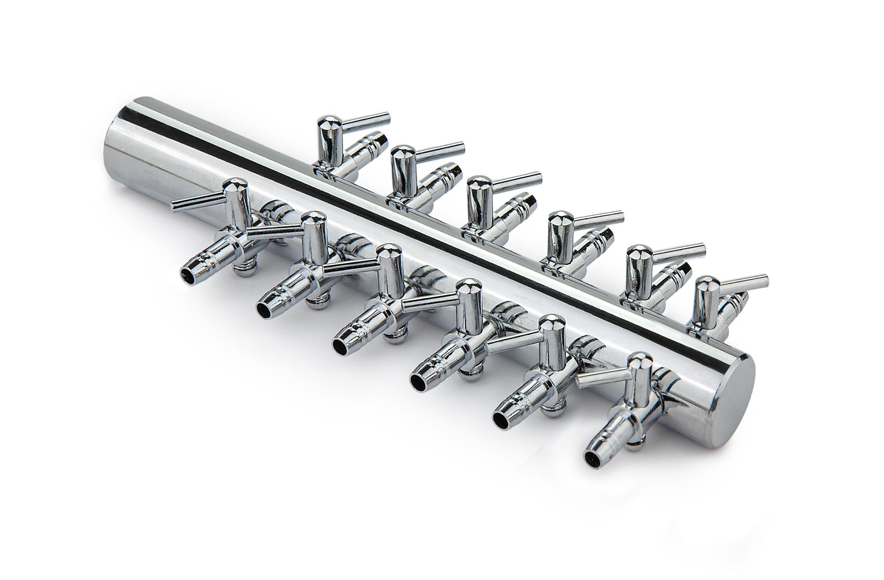 Trwały metalowy rozdzielacz powietrza z 12 wyjściami i precyzyjnymi zaworkami.