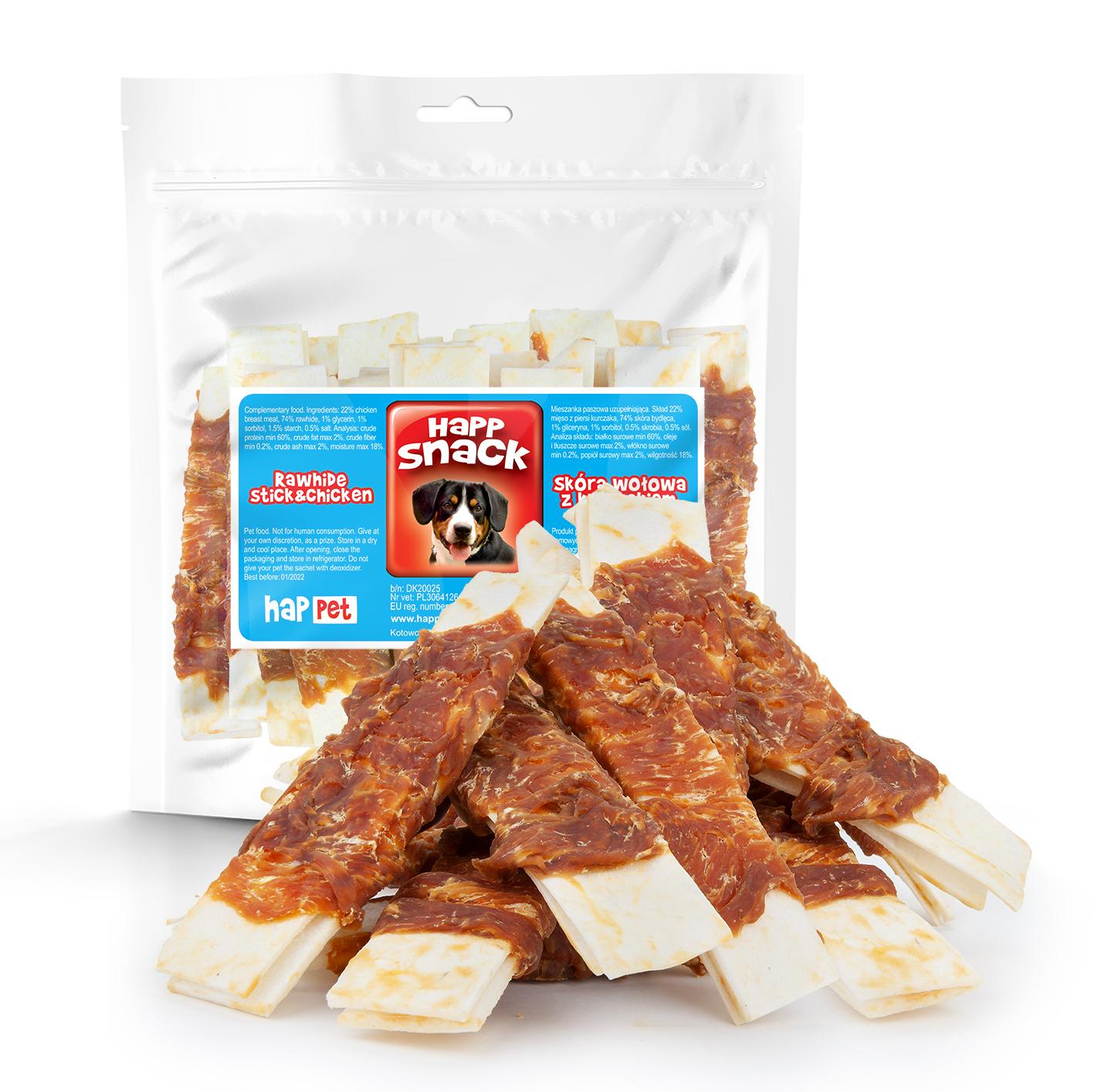 Białe, prasowane paski wykonane z suszonej skóry wołowej, otoczone mięsem z kurczaka. Stanowią świetną przekąskę do podawania między posiłkami i gryzak usuwający kamień i nalot nazębny. Produkt wykonano w 100% z naturalnych składników: prasowanej skóry bydlęcej i delikatnych kawałków piersi kurcząt. Smakołyki dla psów to prawdziwy raj dla podniebienia. Można podawać je także jako nagrodę za postępy w szkoleniach i podczas spaceru z pupilem.