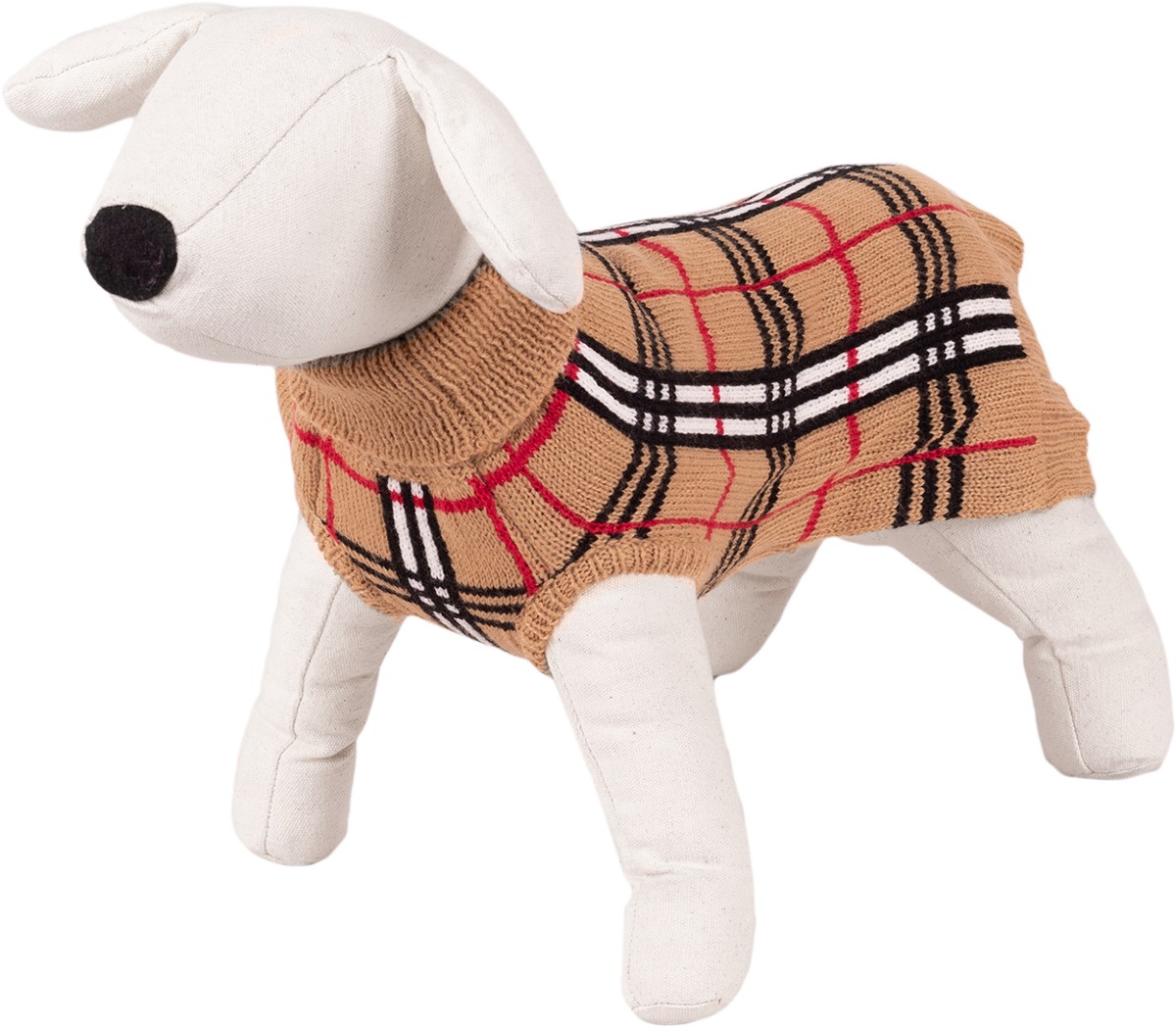 Lekki i ciepły beżowy sweterek w kratę dla małego psa. Wygodny oraz miękki w dotyku, zakładany przez głowę, z  golfem chroniącym szyję psa przed wiatrem. Krój idealnie dopasowany do sylwetki zwierzęcia gwarantuje doskonałą ochronę przed chłodem w okresie jesienno-zimowym. Długość grzbietu 25cm.