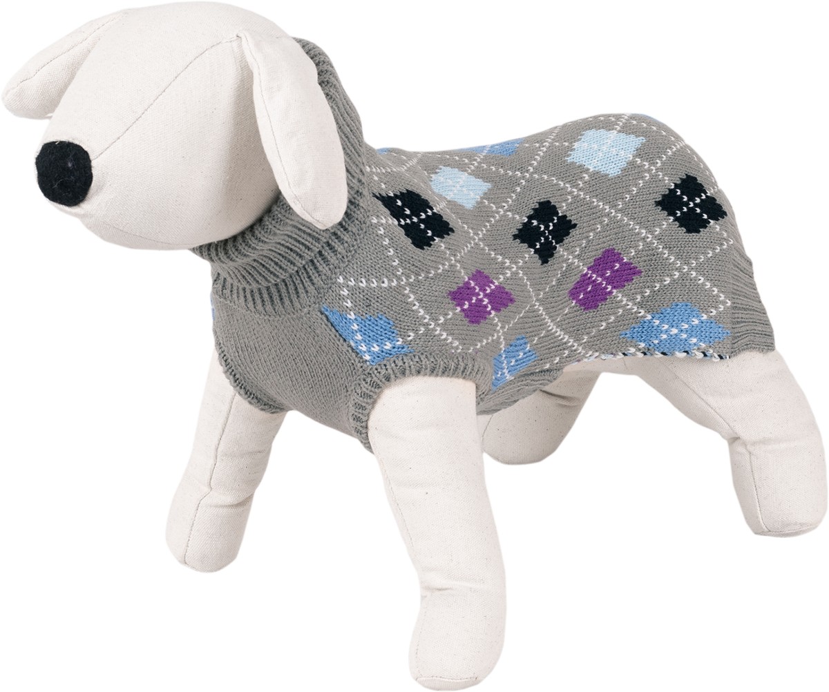 Lekki i ciepły szary sweterek o atrakcyjnym wzorze w romby. Wygodny oraz miękki w dotyku, zakładany przez głowę, z golfem chroniącym szyję psa przed wiatrem. Krój idealnie dopasowany do sylwetki zwierzęcia gwarantuje doskonałą ochronę przed chłodem w okresie jesienno-zimowym. Długość grzbietu 40 cm.