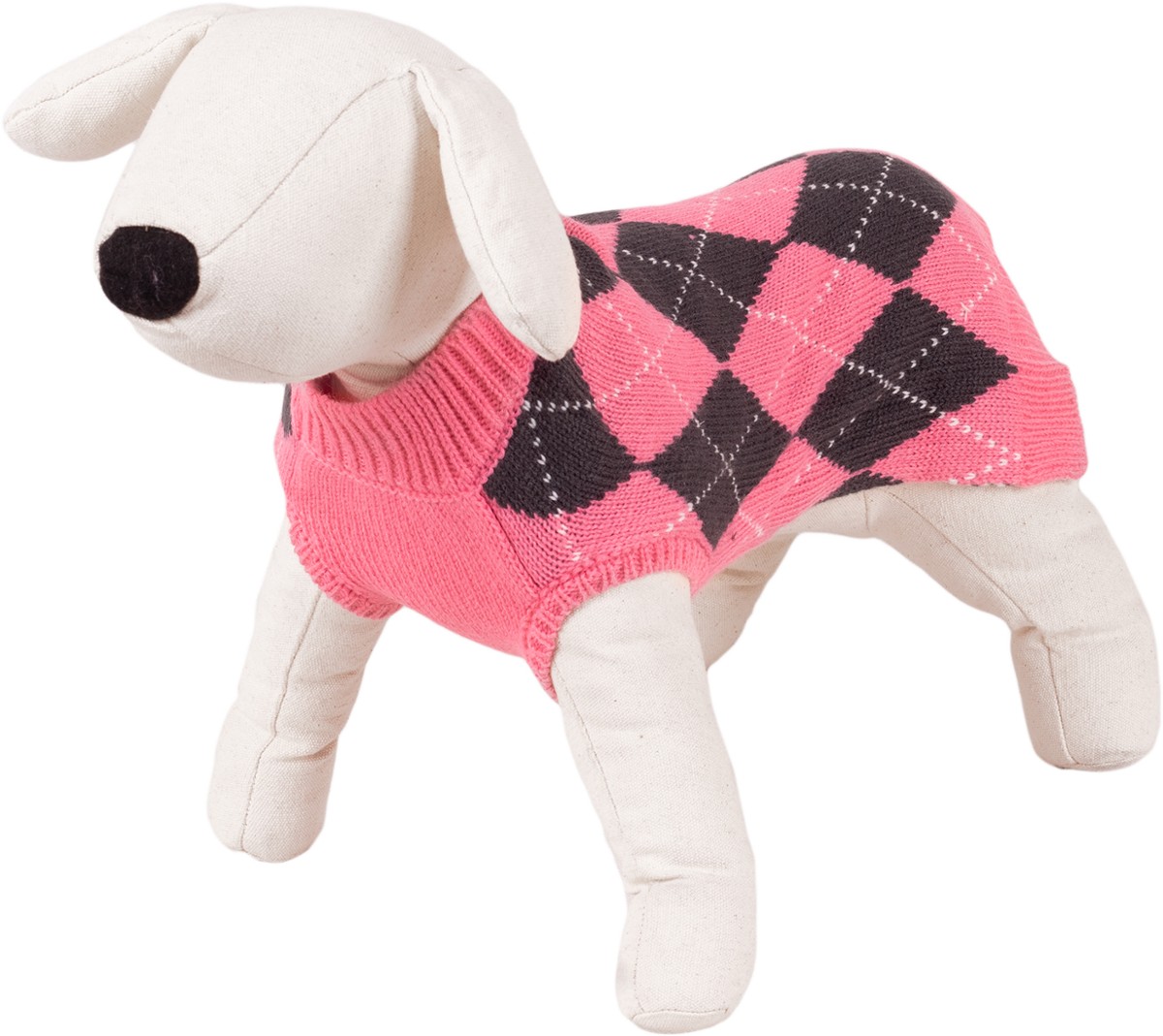 Lekki i ciepły sweterek w romby różowo-grafitowe. Wygodny oraz miękki w dotyku, zakładany przez głowę, ze ściągaczem przy szyi. Krój idealnie dopasowany do sylwetki zwierzęcia gwarantuje doskonałą ochronę przed chłodem w okresie jesienno-zimowym. Długość grzbietu 35 cm.