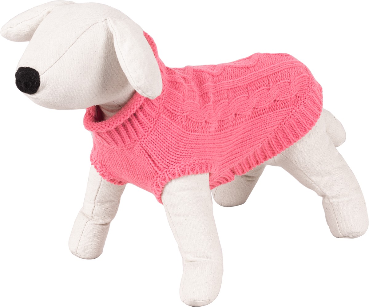 Lekki i ciepły różowy sweterek z warkoczowym splotem. Wygodny oraz miękki w dotyku, zakładany przez głowę, ze ściągaczem przy szyi. Krój idealnie dopasowany do sylwetki zwierzęcia gwarantuje doskonałą ochronę przed chłodem w okresie jesienno-zimowym. Długość grzbietu 30 cm.