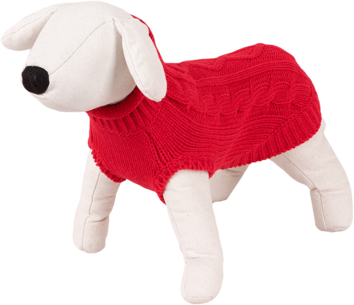 Lekki i ciepły czerwony sweterek z warkoczowym splotem. Wygodny oraz miękki w dotyku, zakładany przez głowę, ze ściągaczem przy szyi. Krój idealnie dopasowany do sylwetki zwierzęcia gwarantuje doskonałą ochronę przed chłodem w okresie jesienno-zimowym. Długość grzbietu 30 cm.