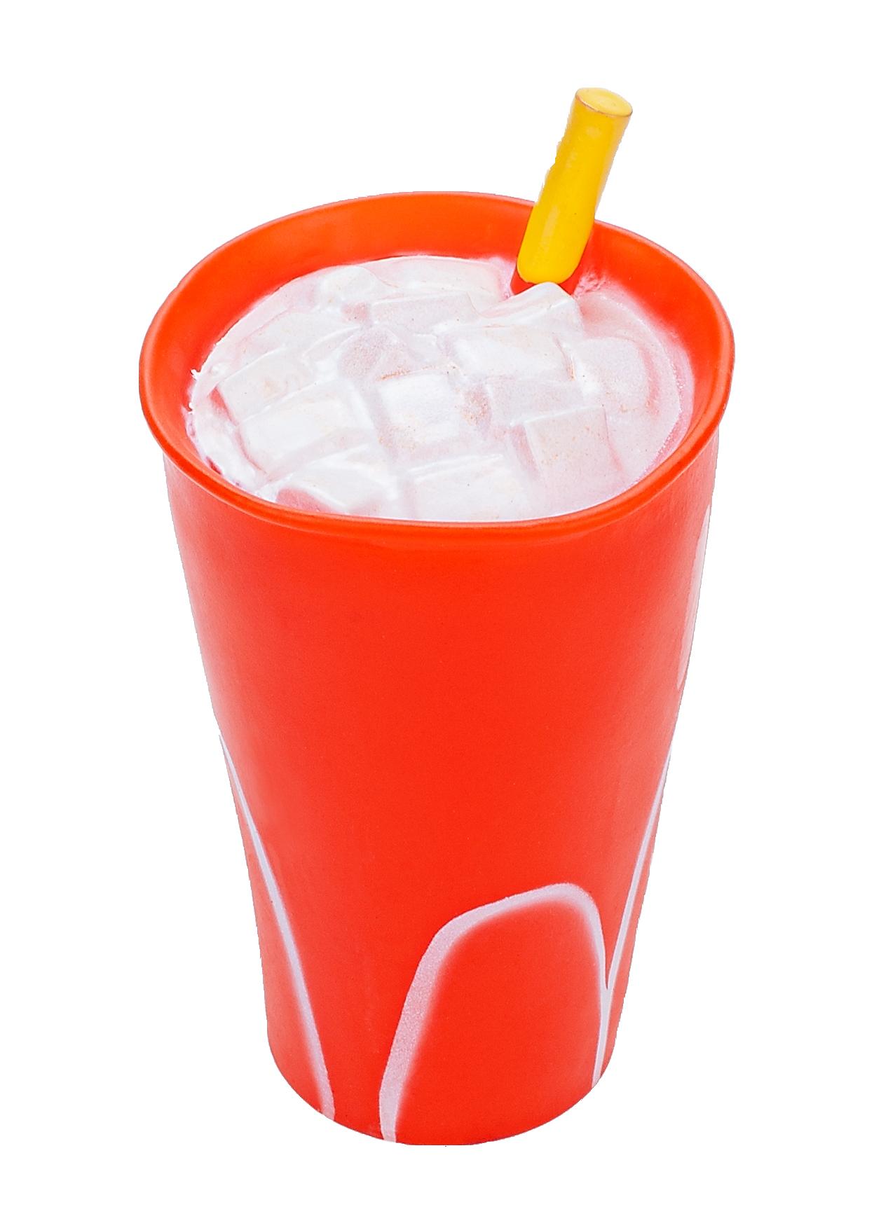 Czerwony kubek jest wypełniony białym napojem, z którego wystaje krótka, miękka słoma. Całość wykonana jest z tego samego materiału.