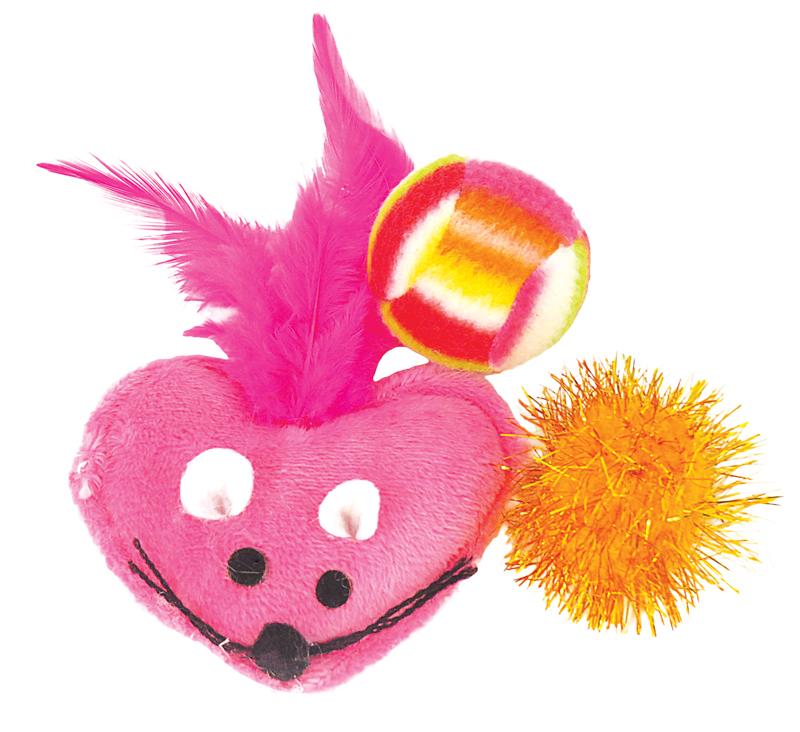 W skład zestawu wchodzą: zabawka w kształcie myszki z pierzastym ogonem oraz dwie piłeczki o różnej długości włosia.