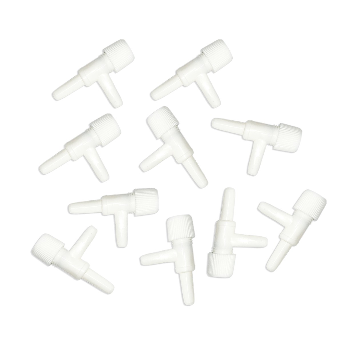 Zawory regulacyjne do napowietrzaczy akwarystycznych. Wykonane z plastiku w kolorze białym. Posiadają pokrętło, które pozwala na otwieranie, zamykanie i regulację przepływu powietrza.